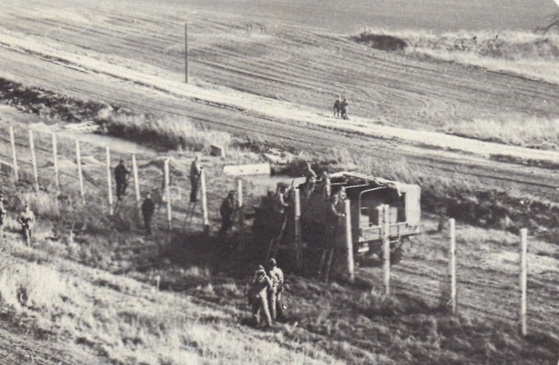 Eine Arbeitskolonne der DDR Grenzer bei arbeiten am Grenzzaun unter Bewachung der Kameraden, diesseits des Zauns