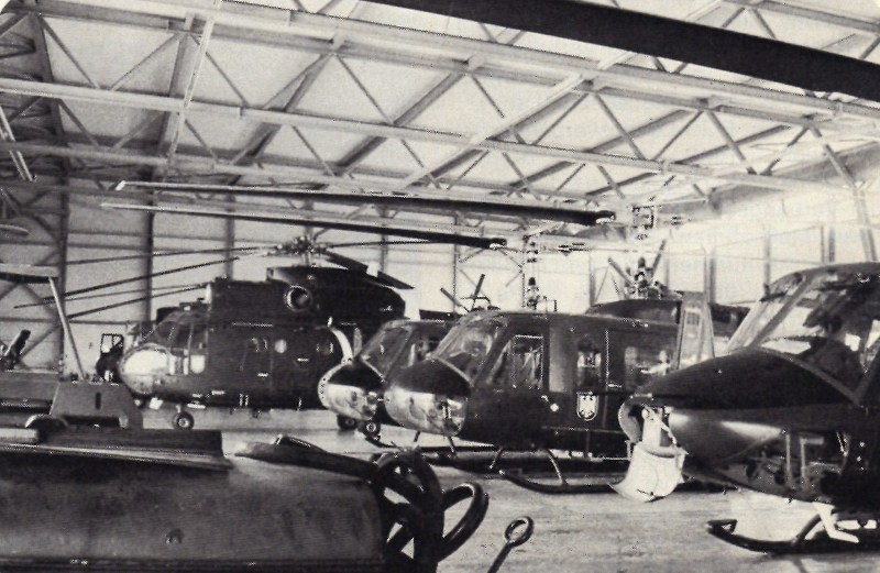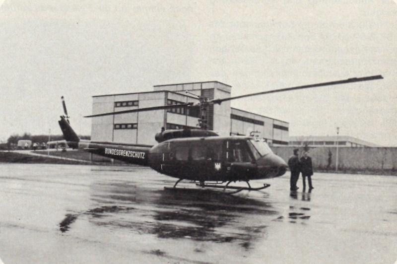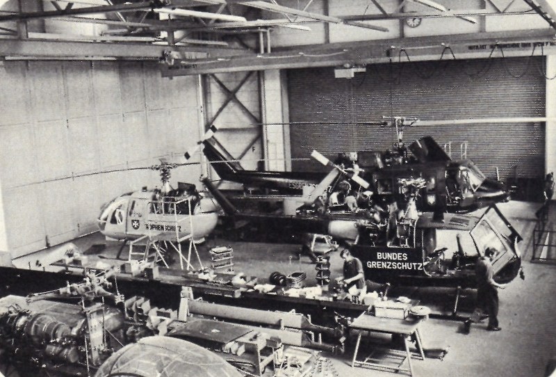 Wartung der Hubschrauber durch technisches Personal des Bundesgrenzschutzes Blick in die Halle der Stabs-und Ausbildungsstaffel. Vorn eine Bell 212, dahinter Bell UH-1D sowie die SA 330 "Puma"