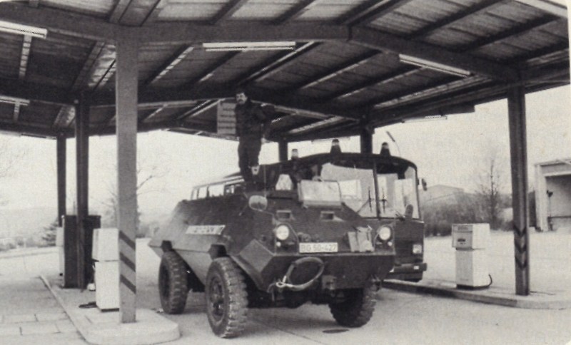 Ein geschütztes Fahrzeug des Bundesgrenzschutzes wird betankt