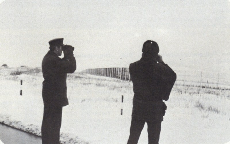 Arbeiten an den Grenzanlagen vor dem Metallgitterzaun: Freischneiden für gute Sicht Journalisten nach einem Rundflug über Bonn, Polizeirat i.BGS Grützner (li) und Kommandeur Heinz Georg, (re) beide GSK West
