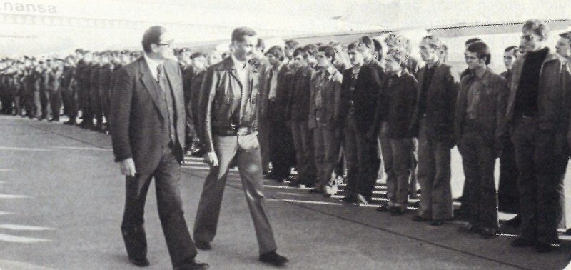 Der Bundesinnenminister schreitet zusammen mit Ulrich Wegener die Front der GSG 9 ab
