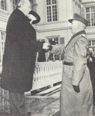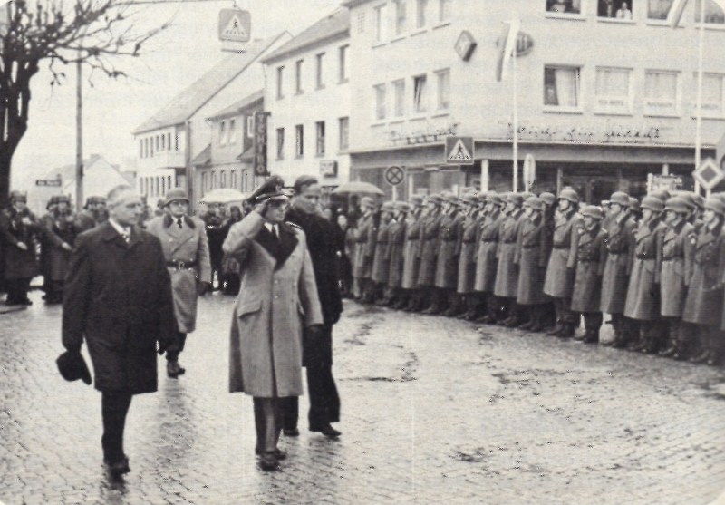 Bundeskanzler Adenauer bedankt sich 1956 bei Gustav Honebrinker, Leiter des Musikkorps, für das dargebrachte Morgenständchen