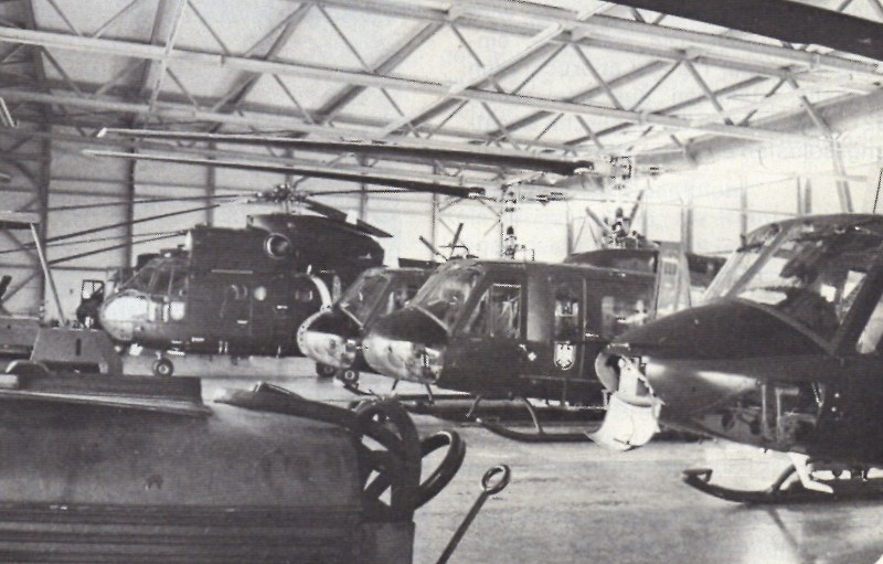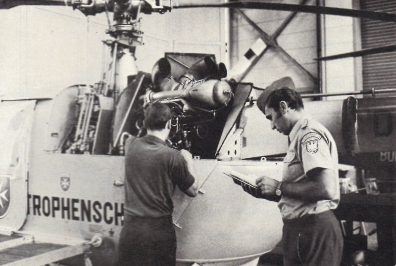 Wartung eines Rettungshubschraubers des Katastrophenschutzes durch Fachpersonal des Bundesgrenzschutzes