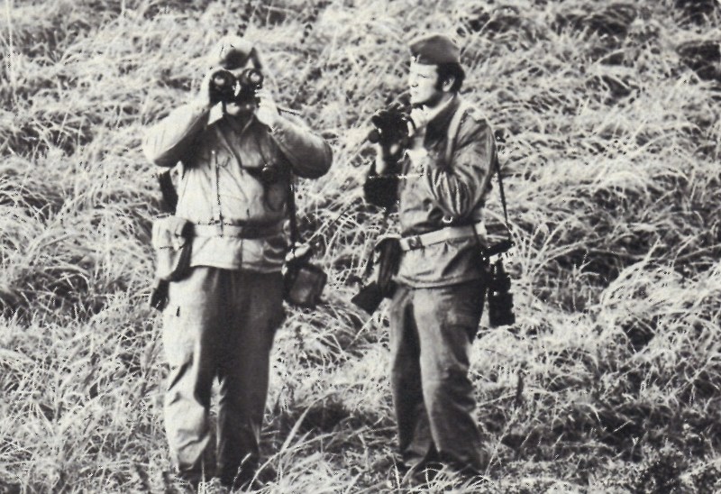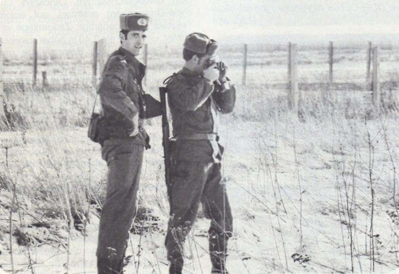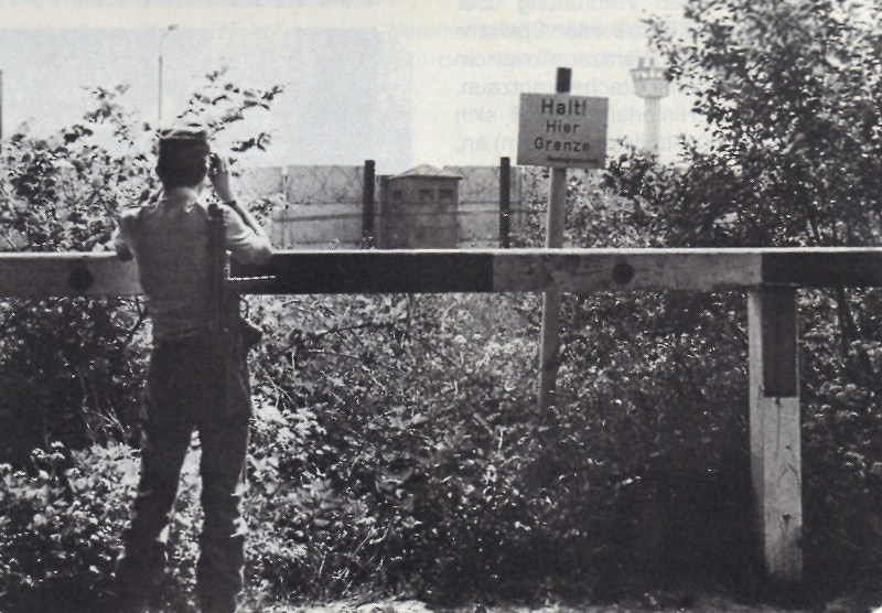 Hauptmann der Grenztruppen der DDR mit einem fotografierenden Grenzaufklärer zwischen dem Zaun und der Grenze