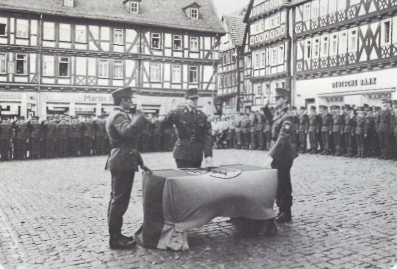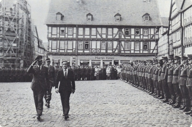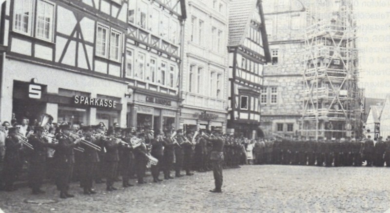 Musikkorps des GSK Mitte führt die Dienstanfänger zur Vereidigung auf den Marktplatz des BGS-Standortes Alsfeld 185 Dienstanfänger der GSA A Mitte I legten am 15. Sept. 1978 auf dem Marktplatz den Diensteid ab Im offenen Viereck sind Musikkorps und Dienstanfänger auf dem Marktplatz angetreten Parlamentarischer Staatssekretär von Schoeler und Kommandeur Rudloff schreiten die Front der BGS-Aufstellung ab Die Dienstanfänger sprechen die Eidesformel Bildmitte: Parl.-Staatsekretär von Schöler, Kommandeur i. BGS A. Rudloff und PR Hermann Casel, Stab GSK Mitte