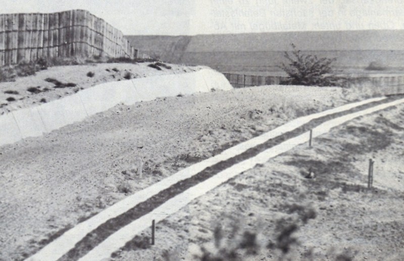 DDR Grenzsperrsystem südlich des Harzes an einen Grenzknick. vorne Kolonnenweg, Pfahl rechts: Anschluß für Meldetelefon