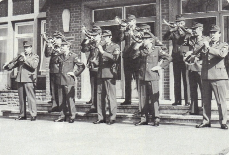 Jagdhornbläser der GSA A Nord I, Bodenteich vor dem Offiziersheim der Abteilung anläßlich des 40 jährigen Dienstjubiläum von PHM Schumann