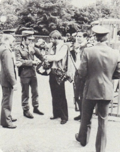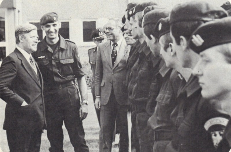Bundeskanzler Helmut Schmidt im Gespräch mit dem Kommandeur der GSG 9. LtdPolDir Ulrich Wegener und seinen Männern
